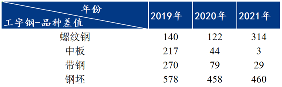 表1:工字鋼與其他品種價差(單位:元/噸)