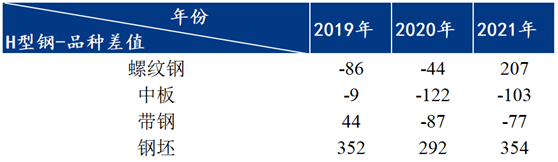 表2:H型鋼與其他品種價差(單位:元/噸)