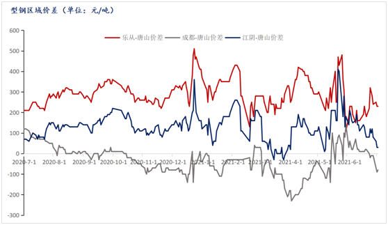 圖2:2021年型鋼區(qū)域價差走勢圖 數(shù)據(jù)來源:鋼聯(lián)數(shù)據(jù)