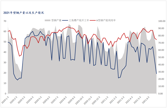 圖3:全國樣本企業(yè)型鋼產(chǎn)量以及生產(chǎn)情況示意圖 數(shù)據(jù)來源:鋼聯(lián)數(shù)據(jù)