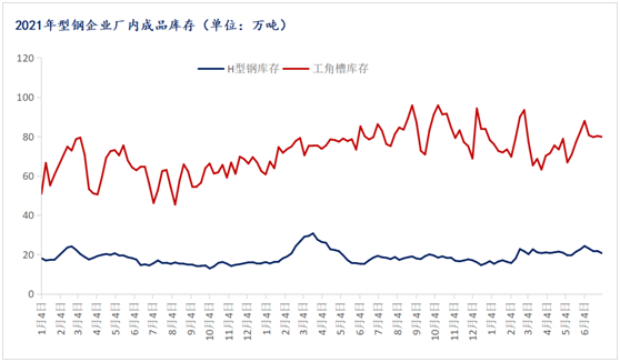 2021年型鋼企業(yè)廠內(nèi)庫存同比2020年相差不大,據(jù)Mysteel同口徑數(shù)據(jù)全國樣本型鋼企業(yè)廠內(nèi)成品庫存平均為96.29萬噸,其中工角槽76.09萬噸,H型鋼20.20萬噸。社會庫存根據(jù)走訪調(diào)研,H型鋼社會庫存在5-6月份相對而言壓力較大,一方面下游需求疲軟,另外鋼廠結(jié)算價格較高,盈利水平有限,工角槽方面由于行情大幅波動,貿(mào)易商以“賭”做庫存的心態(tài)明顯減弱,多以控制庫存,減小經(jīng)營風險。