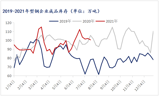 從圖上可以看出,2020年伊始至今,廠內(nèi)型鋼成品庫較2019年都屬于較高位水平,一定反映了自2020年疫情至今,型鋼價格劇烈波動,導致貿(mào)易商心態(tài)偏謹慎,社庫的蓄水池明顯減弱。在2021年下半年這一情況或?qū)⒊掷m(xù)。